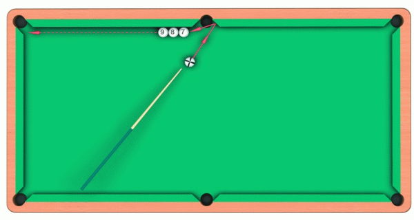 Шары «7», «8» и «9» выставлены в ряд вдоль длинного борта у раствора средней лузы. Биток размещен на некотором расстоянии от играемых шаров. Необходимо положить в лузу прицельные шары. Для того чтобы выполнить трюк, нужно наносить по битку удары, направленные в точку, показанную на рисунке.