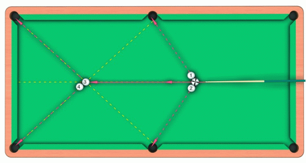 На середине стола выставляются шары «1» и «2». Между ними размещается биток. «Тройка» и «четверка» стоят на дальней от «дома» линии. Необходимо с одного удара положить шары в лузы: «единицу» и «двойку» – в средние, «тройку» и «четверку» – в угловые. Для того чтобы выполнить трюк, необходимо нанести прямой удар по битку. В результате шары будут сдвинуты с места и почти одновременно окажутся в назначенных лузах.