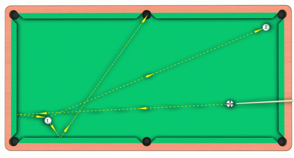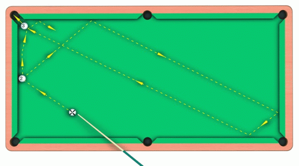 «Тройка» располагается в растворе левой угловой лузы. «Двойка» выставляется близко к левому короткому борту, на его середине. Биток располагается так, чтобы его центр и центр левой нижней угловой лузы находились на одной прямой. Необходимо в левую верхнюю лузу положить шары «2» и «3». Для того чтобы решить поставленную задачу, нужно нанести по битку сильный удар в верхнюю точку. В результате «свой» шар столкнется с «двойкой», которая, отразившись от трех бортов, пойдет в угол и будет положена. Но прежде, после удара битка, в той же лузе окажется «тройка».