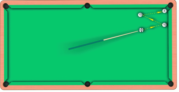 Для успешного выполнения трюка нужно «пятнадцатый» шар выставить несколько дальше от угловой лузы, чем «десятый». Удар следует выполнять по схеме, представленной на рисунке.