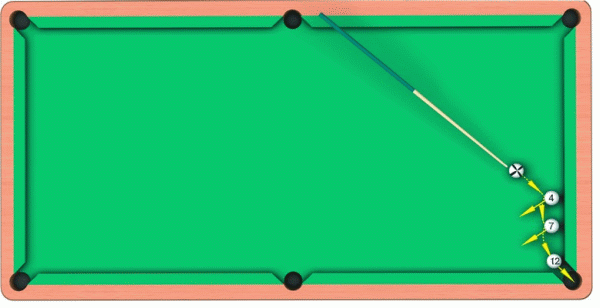 «Четверка», «семерка» и «двенадцатый» выставляются вдоль короткого борта недалеко от угловой лузы. Для того чтобы сыграть «двенадцатый» в лузу, необходимо нанести по битку сильный удар накатом с левым боковиком. В результате биток сдвинет с места сначала «четверку», а затем и «семерку», после чего направится к «двенадцатому» и положит его в лузу.