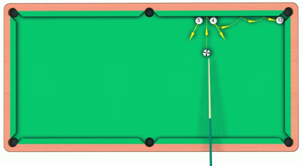 Для того чтобы выполнить трюк, необходимо по битку нанести сильный правый верхний боковик по схеме, показанной на рисунке. В результате биток разобьет шары «5» и «4», а затем медленно подкатится к «двенадцатому» и положит его в угол.