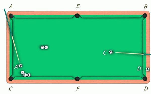 Существует еще один вариант подобного трюка. «Шестерку» выставляют на линии «до-ма», а рядом с ней размещают «семерку». Биток устанавливают в точке C. Необходимо положить в лузу E шар «7».