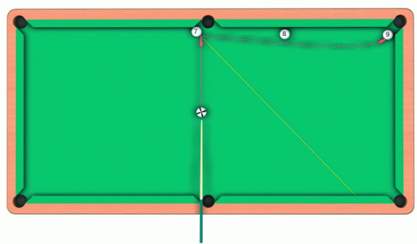 Для того, чтобы выполнить трюк, необходимо класть «девятку» резкой в полшара по «семерке». Вследствие удара «свой» шар отразится от «семерки», затем пойдет в направлении угловой лузы и, не стушевав «восьмерку», положит «девятку».