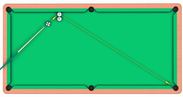 Для успешного проведения трюка необходимо с силой крутануть шары так, чтобы они начали вращаться в противоположных направлениях, двигаясь в сторону другого короткого борта. При этом «туз» должен оказаться впереди «двойки».