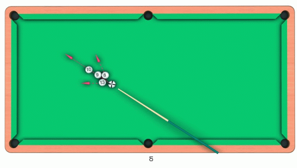 биток и «тринадцатый» будут двигаться в противоположные стороны, а «восьмерка» направит «девятку» в назначенный угол.Такой трюк можно продемонстрировать, выставив на стол пять шаров. При этом в лузу нужно положить «десятку». Для того чтобы успешно провести трюк, необходимо шары «13» и «8» поставить близко друг к другу. Затем ударом битка разбивается пара шаров «тринадцатый» – «восьмерка», после чего биток собьет «девятку» и направит ее к прицельному шару.