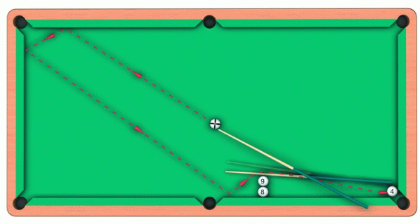 «Девятка» и «восьмерка» стоят перпендикулярно к длинному борту. «Четверка» выставлена в растворе угловой лузы. Игрок объявляет, что положит «четверку» в лузу без туша его кием и двумя другими играемыми шарами.