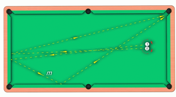 В результате «единица» пойдет вперед по траектории m и, отразившись от двух бортов стола, ляжет в назначенную лузу. В ту же лузу упадет и «двойка», предварительно оттолкнувшись от одного борта.
