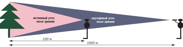 Поле зрения = Field of View. Физическая ширина видимой части объекта на расстоянии 1000 м. Если вы с расстояния 1000 м наблюдаете объект, равный по ширине 100 м, и он целиком виден в окуляр, то поле зрения вашего бинокля равняется 100 м. Данный параметр также зависит от кратности и диаметра линзы объектива, но с помощью различных современных технологических приёмов для некоторых биноклей производители могут искусственно расширить угол и поле зрения.