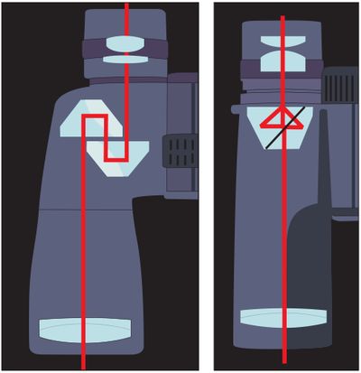 Схемы биноклей с PORRO-призмой (слева) и ROOF-призмой
