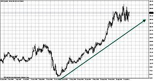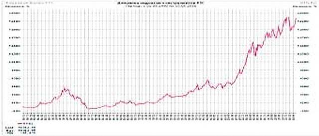 Рост основного биржевого индекса России с 1995 года по весну 2008 года.
