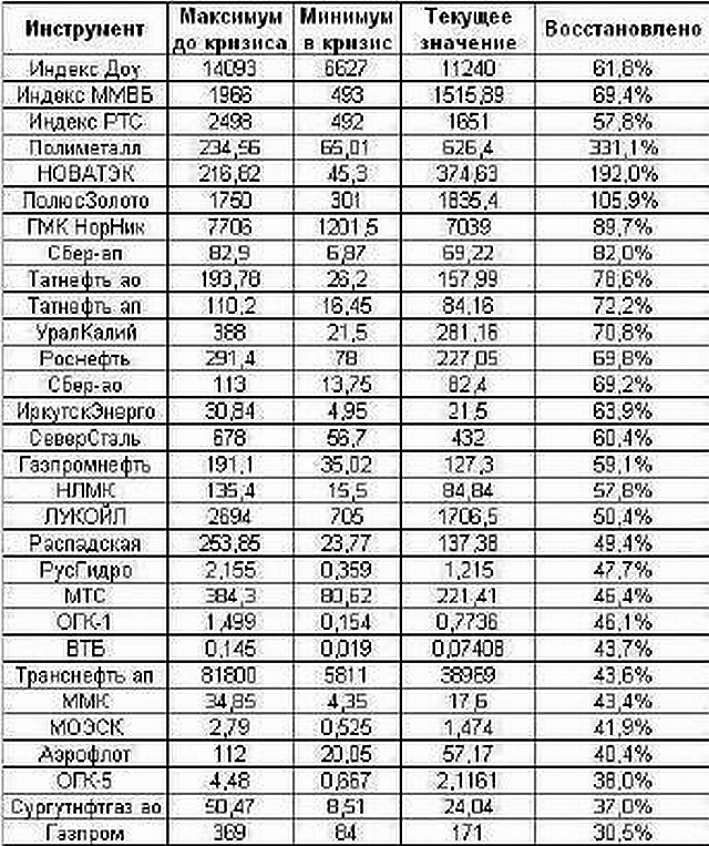 В настоящее время рынки активно восстанавливаются после финансового кризиса. Некоторые акции не только вышли на свои докризисные значения, но и значительно превысили исторические максимумы.