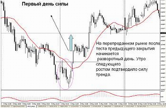 Вторая ступенька лестницы – покупка силы. Развороты цены, которые хочет купить или продать каждый трейдер, как правило, происходят в моменты избыточности движения котировок, т. е. на отрезках перекупленности или перепроданности. Мастерство трейдинга состоит в том, чтобы продавать на перекупленном рынке и покупать на перепроданном, а не наоборот, как делают начинающие, не прошедшие обучения инвесторы.