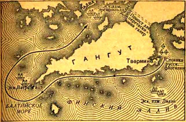 Ватранг, растянув суда поперек Финского залива, отдалился от полуострова. Теперь остальная часть русского галерного флота могла обогнуть мыс, пройдя у самого берега.