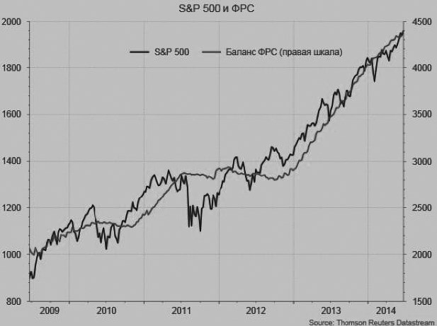 Примечание: правая шкала – баланс ФРС в млрд. долларов, левая шкала – индекс S&P 500 в б/п.