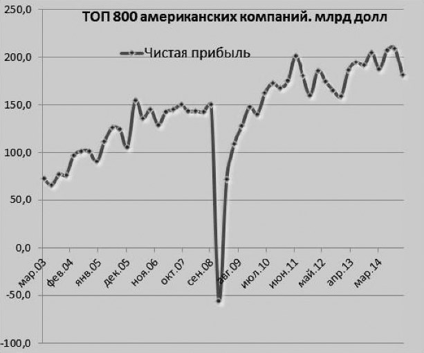 Анализ проведенных в результате трех раундов количественного смягчения (QE) в 2008-2014 гг. вливаний сотен миллиардов долларов в экономику США свидетельствует о низкой эффективности этой политики, с точки зрения воспроизводства реального сектора экономики. Большая часть эмитированных денег вместо стимулирования роста национальной экономики попадает на финансовые рынки, где используется в спекулятивной игре, искусственно раздувая рыночную капитализацию кампаний. Рисунок 7 демонстрирует сильную зависимость роста ведущих компаний США (индекс S&P 500) от раундов количественного смягчения. За ними же следует динамика чистой прибыли 800 крупнейших компаний США (Рис. 8). По сути, доходы и рыночная капитализация американской экономики раздувается инфляционным образом за счет денежной эмиссии. Такая политика влечет не только национальную, но и мировую инфляцию,