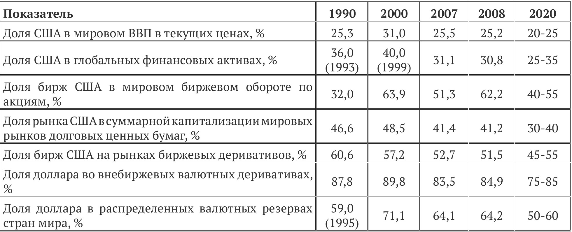 Табл. 3. Роль США в мировой финансовой системе с прогнозом до 2020 г.