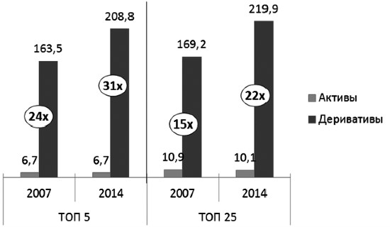 Рис. 2. Крупнейшие (top-5 и top-25) американские финансовые холдинги – держатели деривативов: объем деривативов, активов (трлн. долл.) и их соотношение (разы)