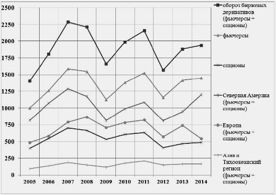 Рис. 4. Оборот биржевых деривативов по регионам мира в 2005-2014 гг., трлн. долларов