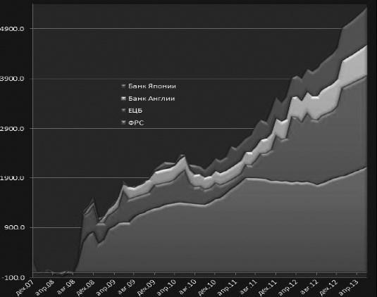 ФРС США заливает нарастающие дисбалансы в долларовой финансовой системе денежной эмиссией, которая ведется уже не только под долговые обязательства государства, но и под спасение крупных частных банков. В разгар глобального финансово-экономического кризиса в 2008-2010 гг. ФРС тайно выпустила 16 трлн. долл., чтобы выдать беспроцентные кредиты крупнейшим банкам США, Великобритании, Германии, Франции и Швейцарии (Табл. 2). Эта цифра сопоставима с размером ВВП США 27 . На середину 2014 г. «счетчик американского долга» 28 определил величину совокупного долга США в 62 трлн. долл., что равно всему мировому ВВП в 2008 г. (61 трлн. долл.), сегодня он оценивается в 70-75 трлн. долл. Вслед за ФРС США денежную накачку своих экономик ведут эмитенты других мировых валют (Рис. 5).