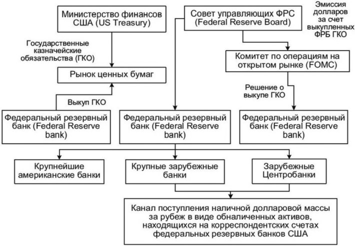 так как часть денег попадает на мировые рынки сырья, энергоносителей, продовольствия 29 . Неограниченная эмиссия доллара частично выливается за рубеж США, частично связывается в пирамиде американских деривативов и необеспеченных обязательств. При этом значительный объем денежных потоков и активов финансовых институтов сконцентрирован в офшорах (30-35% глобальных финансовых активов). Сбрасывая около половины эмитируемых долларов за рубеж, американские денежные власти стерилизуют избыточную денежную массу, используя эмиссионный доход в целях финансирования государственных, в том числе, военных расходов. Принимая доллары, другие страны фактически финансируют эти расходы, покрывая эту часть долларовой эмиссии поставками реальных материальных ценностей. Другая часть долларовой эмиссии стерилизуется в результате финансовых кризисов путем схлопывания финансовых пузырей и обесценения вложенных в них частных капиталов. Но прежде чем выйти из американской финансовой системы, эмитируемые ФРС доллары проходят через государственный бюджет и растекаются по каналам рефинансирования американских корпораций, обслуживая их экспансию на мировой рынок.29