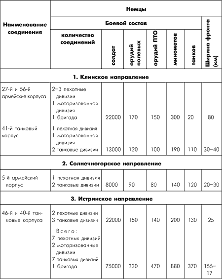 угрозой. Однако под мощными ударами наших наступающих частей противник вынужден был в беспорядке отходить, бросая технику и вооружение, немецкое командование пыталось задержать свои разбитые войска на линии: Терехово, Клин, Истринское водохранилище, город Истра, река Нара, а затем на рубеже рек Ламы и Рузы.Таблица соотношения сил на правом крыле Западного фронта к 6 декабря 1941 года