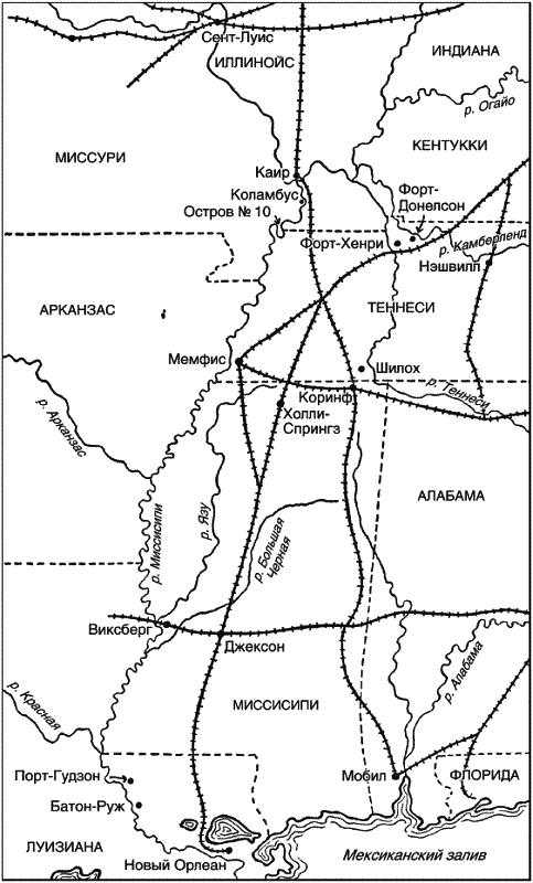 Причиной было то, что к тому времени, когда суда были готовы, действия северян в долине Миссисипи приняли совершенно иную форму, нежели предполагала исходная стратегическая концепция конфедератов. Их основные приемы были скорее прочувствованы, чем продуманы, но начали развиваться довольно рано – осенью 1861 года, когда бригадный генерал У.С. Грант, осуществлявший военный контроль над несколько неопределенной местностью из Каира, что в штате Иллинойс, вошел в контакт с коммодором А.Х. Футом, посланным на запад возглавить миссисипскую эскадру.