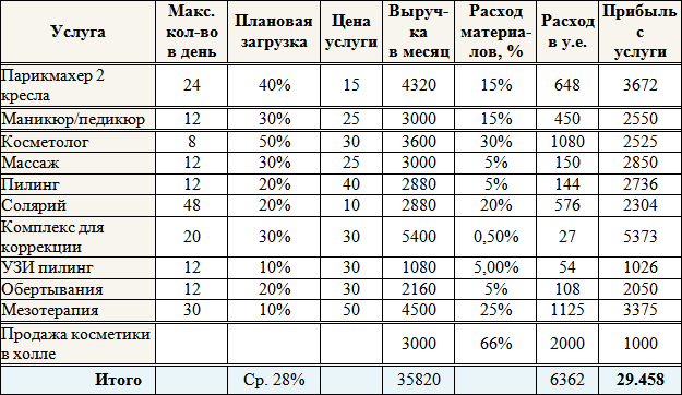 Ежемесячная чистая прибыль салона (без учета налогов) составляет 5.746у.е. В год – 68 952 у.е.