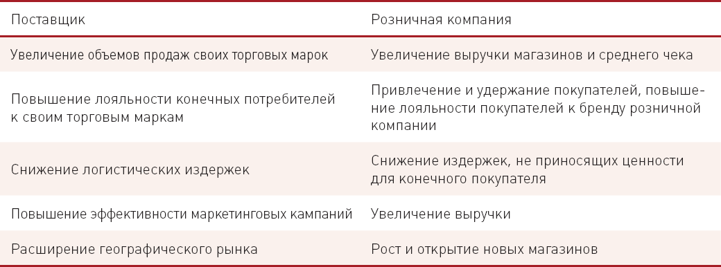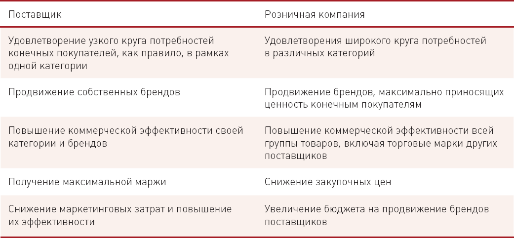 Таблица 1. Различия в целях между поставщиком и розничной компании