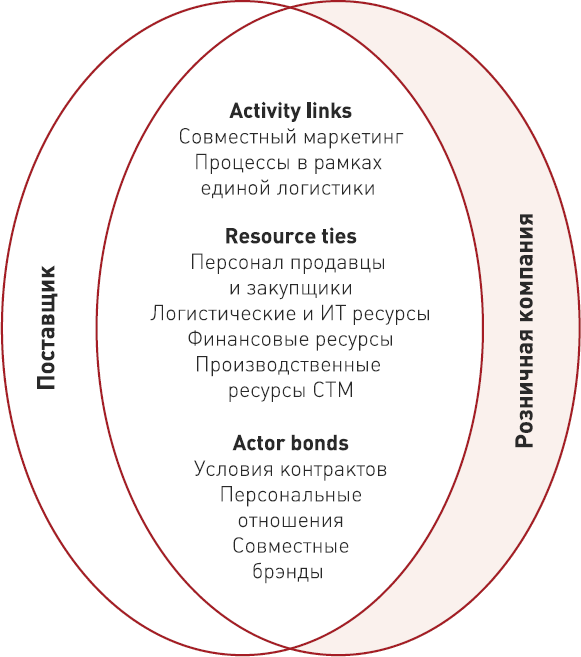 • Связи и отношения (Actor bonds): включают в себя контрактные условия, совместные бренды – например СТМ, и нельзя забывать про персональные отношения, которые складываются между сотрудниками розничной компании и партнера – на пример, KAM (ключевым менеджером по продажам) и КМ (категорийным менеджером).