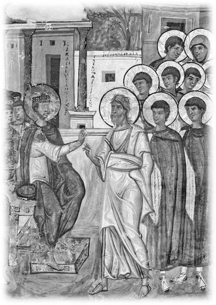 Семь святых мучеников Маккавеев с учителем Елеазаром и мать их Соломония на суде у Антиоха Епифана. Миниатюра. Константинополь. X в. Рим. Ватиканская апостольская библиотека. Законоучитель Елеазар с твердостью пошел на мучения. Такое же мужество проявили ученики святого Елеазара – семь братьев Маккавеев и их мать Соломония. Их судил в Антиохии Антиох Епифан