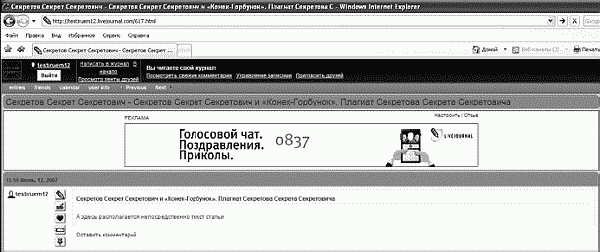 Заголовок страницы – та ее часть, которая находится в самом верху страницы, в браузере, на синем фоне (для Windows XP). Если в название блога и в название статьи вы включите ключевые слова, то как раз получите требуемый эффект. На рисунке 20 показано сообщение, сделанное в Живом Журнале пользователя по имени testiruem12.