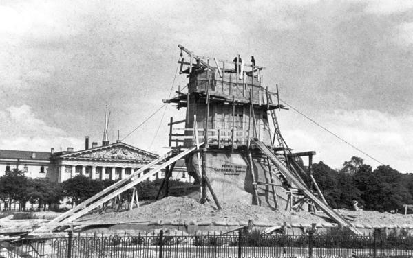 Памятник Петру I на площади Декабристов в защитном устройстве. Август 1941 г.