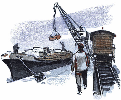 Город Волхов стоит на реке Волхов. Тут, в городе Волхове, грузам предстоит пересадка. Покинут они вагоны. Перейдут на речные баржи. Река Волхов впадает в Ладожское озеро. Поплывут грузы из города Волхова по Волхову к Ладожскому озеру.