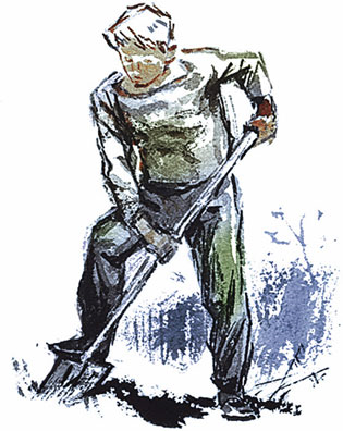 У села Новинки был один из наиболее трудных участков дороги. Болота кругом. Строили дорогу военные. Вышла на помощь и вся Новинка. Старый и малый, здоровый, калеченый – все оказались здесь. Опустела Новинка. Все на дороге. Мишак и Гринька тоже пришли с лопатами. Начался штурм болота. Уж сколько камней и земли здесь насыпали. Возили, возили машины землю. Таскали, таскали носилки люди. Бросали, бросали лопаты землю в бездонную хлябь.