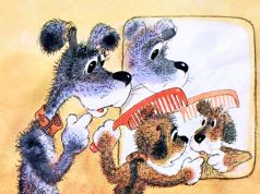 Да это ведь ты сам в зеркале! — засмеялся Барбос.— Как — я? Я ведь здесь, а там другая собака. Барбос тоже подошёл к зеркалу. Бобик увидел его отражение и закричал: