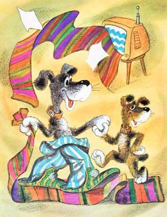 Барбос включил телевизор. Послышалась музыка. Собаки обрадовались и давай прыгать по комнате. Плясали, плясали, из сил выбились.