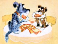 Бобик уселся за стол. Барбоска открыл буфет, видит — там блюдо с киселем стоит, а на верхней полке — большой пирог. Он взял блюдо с киселем, поставил на пол, а сам полез на верхнюю полку за пирогом. Взял его, стал вниз спускаться и попал лапой в кисель. Поскользнувшись, он шлёпнулся прямо на блюдо, и весь кисель у него размазался по спине.