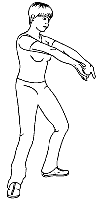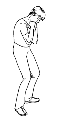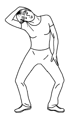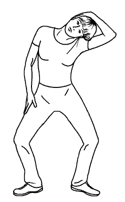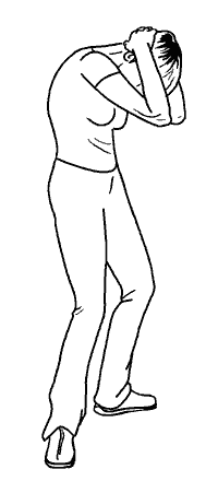 Из исходного положения опустите левую руку на бедро, ладонь развернута во внутрь, правую руку расположите на противоположной части головы.