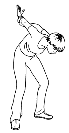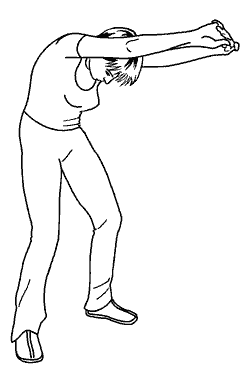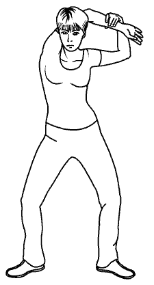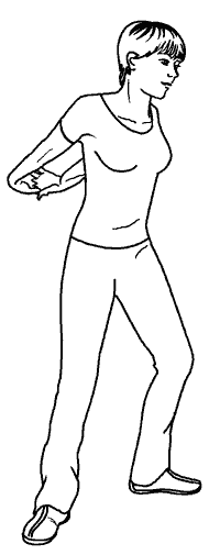 Примите исходное положение: встаньте прямо, ноги на ширине плеч и слегка согнуты в коленях, стопы развернуты наружу, руки заведены за спину – правая рука прямая, левая – слегка согнута в локте и обхватывает предплечье правой руки примерно по середине.