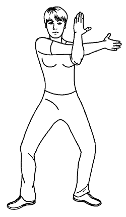 Примите исходное положение: встаньте прямо, ноги на ширине плеч и слегка согнуты в коленях, стопы развернуты наружу, руки свободно опущены вдоль туловища.
