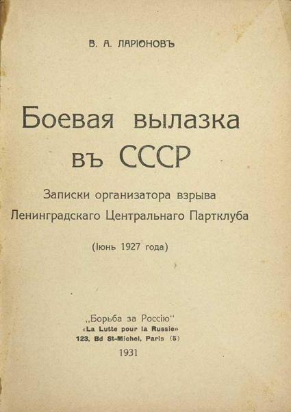 В моем рассказе о боевой вылазке в СССР — о взрыве в июне 1927 года Ленинградского Центрального Партклуба — я умолчал лишь о двух-трех мелких фактах, что вызывается причинами, о которых вряд ли нужно особо распространяться. Не касаюсь я по тем же причинам и самой организации боевой вылазки в СССР. Об этом можно будет рассказать лишь впоследствии, когда борьба с советской