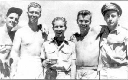 Лейтенанты Уоли Харви и Гровер Голсон (первый и второй слева) позируют со своими боевыми товарищами из 36-й истребительной эскадрильи,