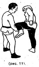 Освобождение от захвата проводится сбиванием рук противника ногой (рис. 11).
