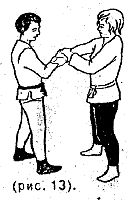 Рассмотрим другой вариант защиты. Прижать левой рукой кисть противника сверху к своей правой руке (рис. 13).