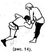 Кистью правой руки захватить правое предплечье нападающего, и, отшагнув правой ногой назад, движением обеих рук вниз вызвать болевое ощущение в запястье, заставляющее противника упасть вперед (рис. 14).