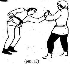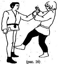 Нанести расслабляющий удар ногой в голень нападающего и повернуть кисть в сторону большого пальца противника (рис. 16).