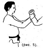 руки противникаПротивник захватил запястье двумя руками снизу (рис. 5).