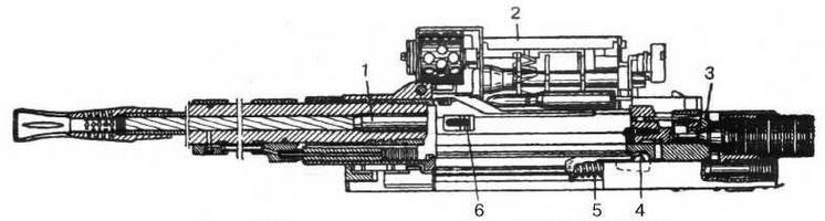 1 — патронник, 2 — ленточный подающий механизм, 3 — затвор, 4 - защелка затвора в запирающем положении, 5 -возвратная пружина, 6 — упор боевого выступа.