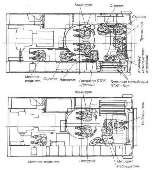 Размещение экипажа и десанта в БМП М2 (вверху) и БРМ M3 (внизу).